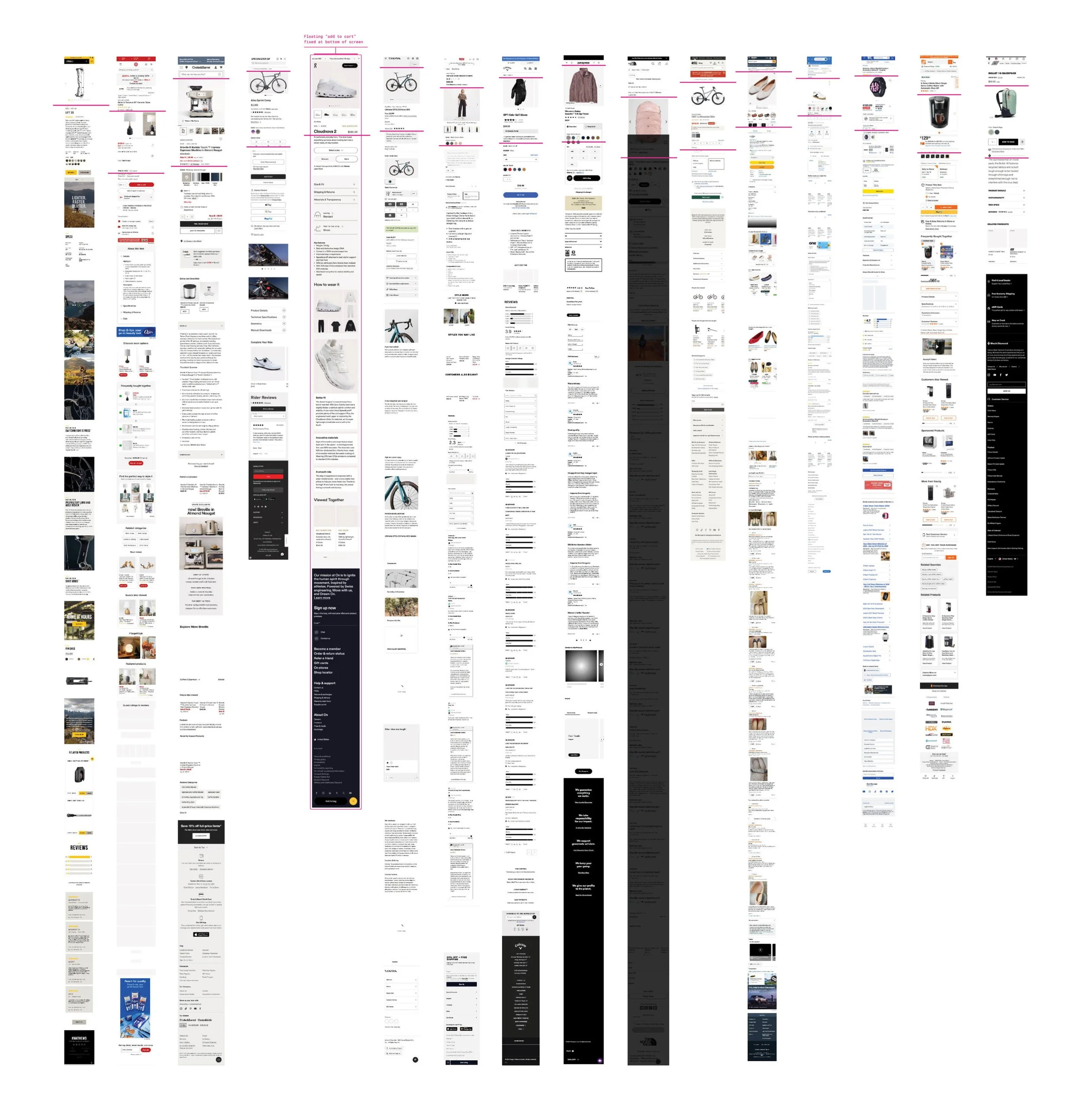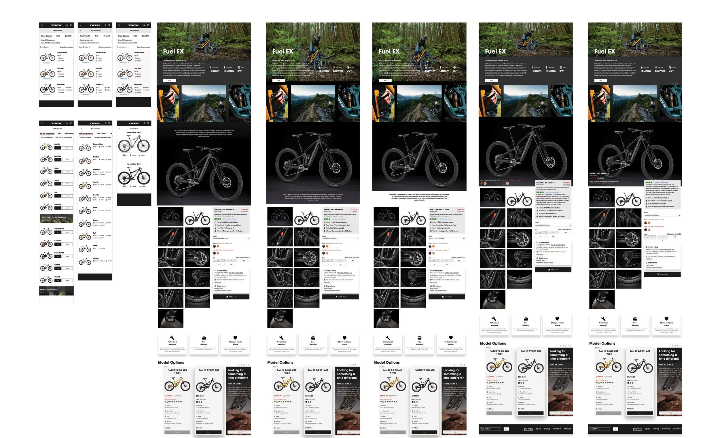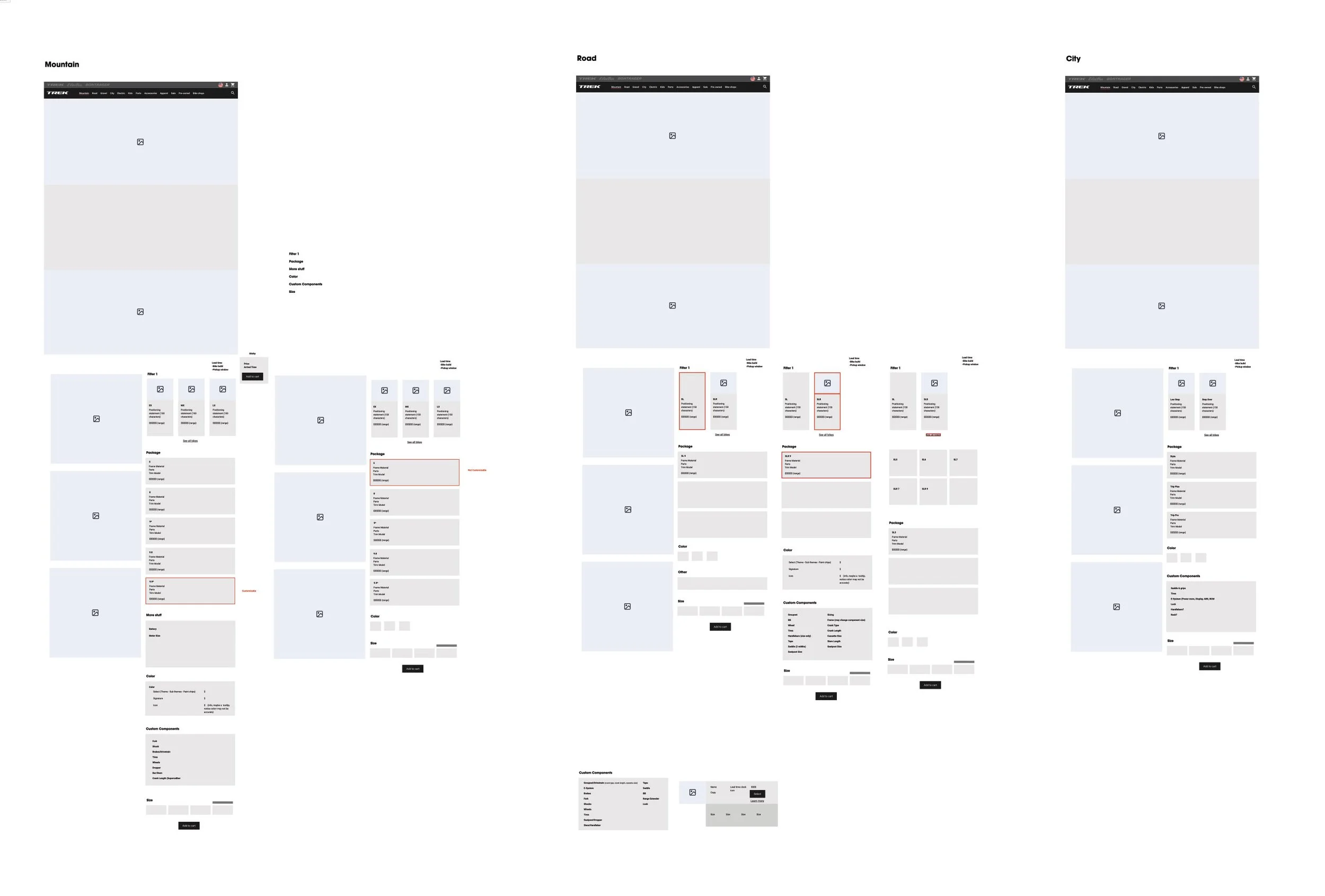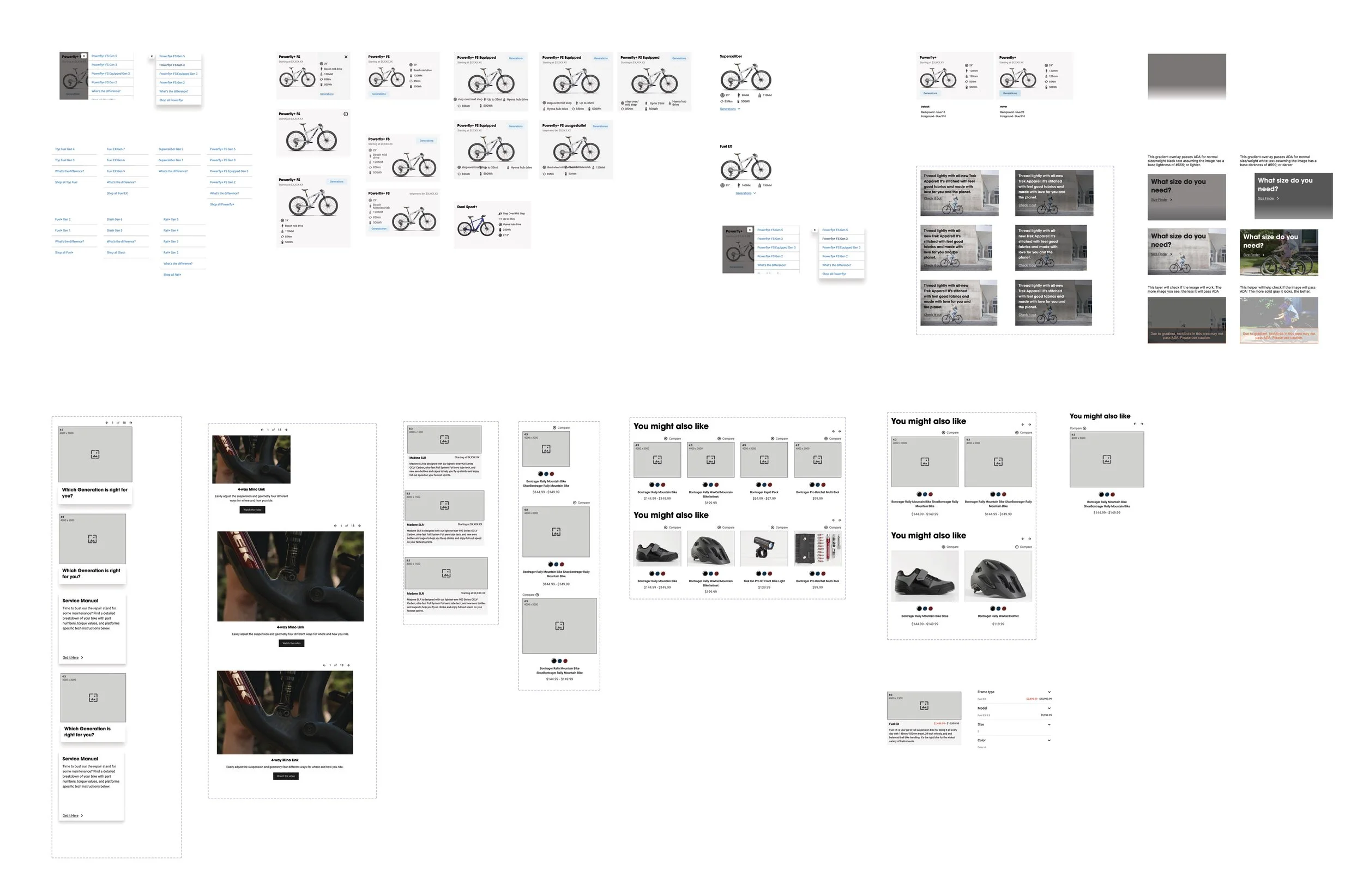 Once it was determined what the product structure and content would be needed for each bike family, I began doing some research and benchmarking to see how the experience could look. I also interviewed store managers to see how customers and themselves customized bikes in store on the current configurator. Mobile was the biggest concern, product detail pages can get very long so it was important to make sure the buy zone was still the priority.