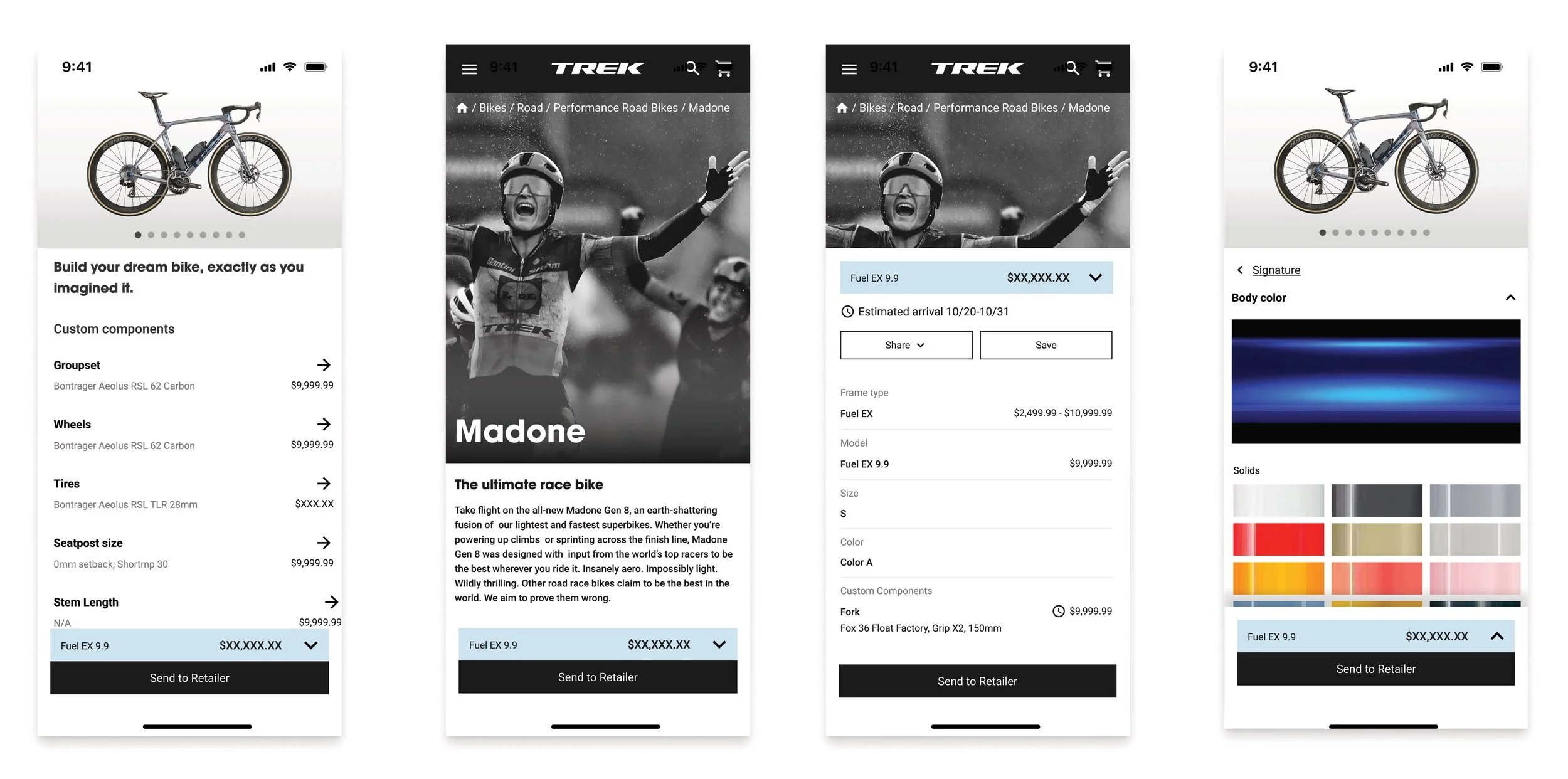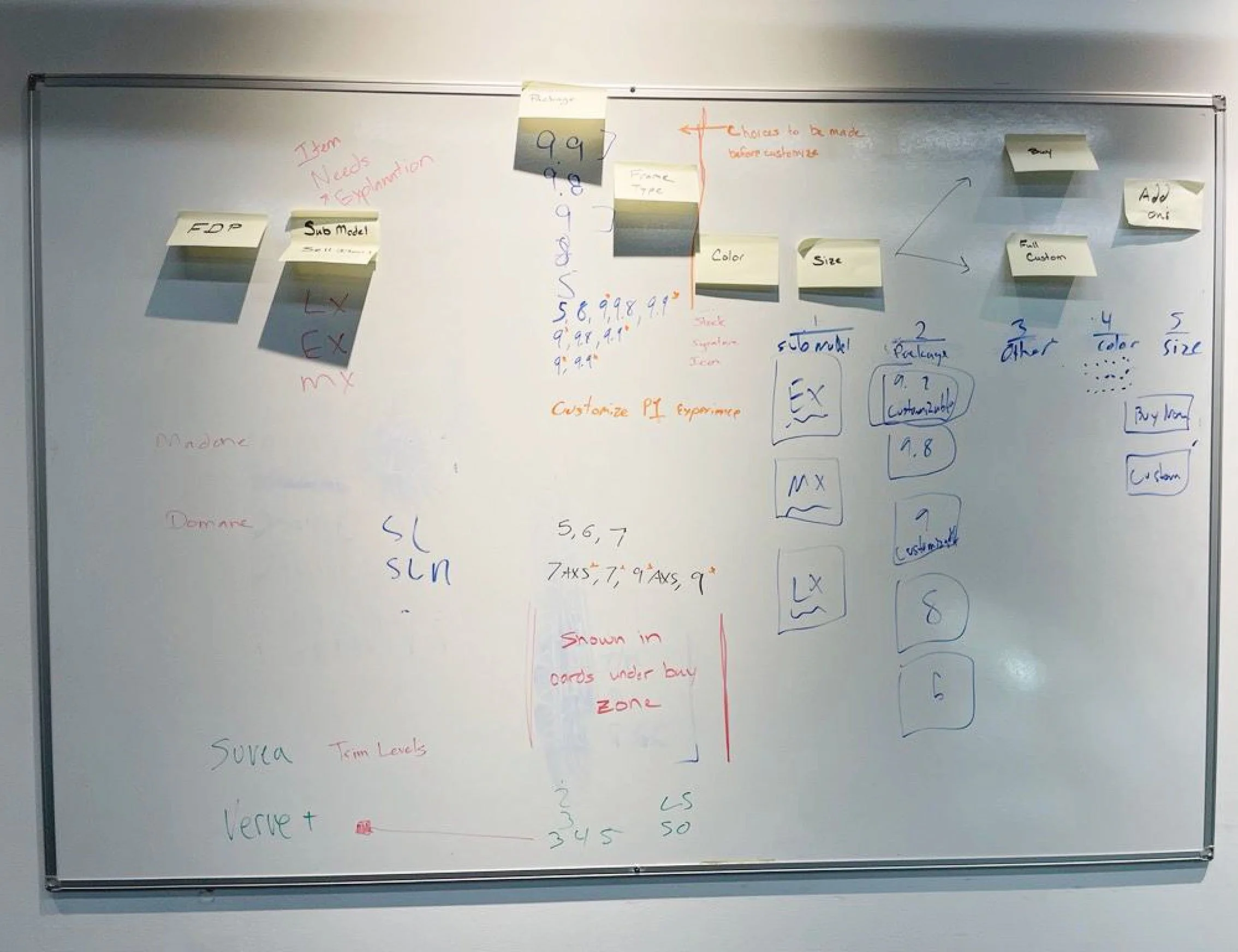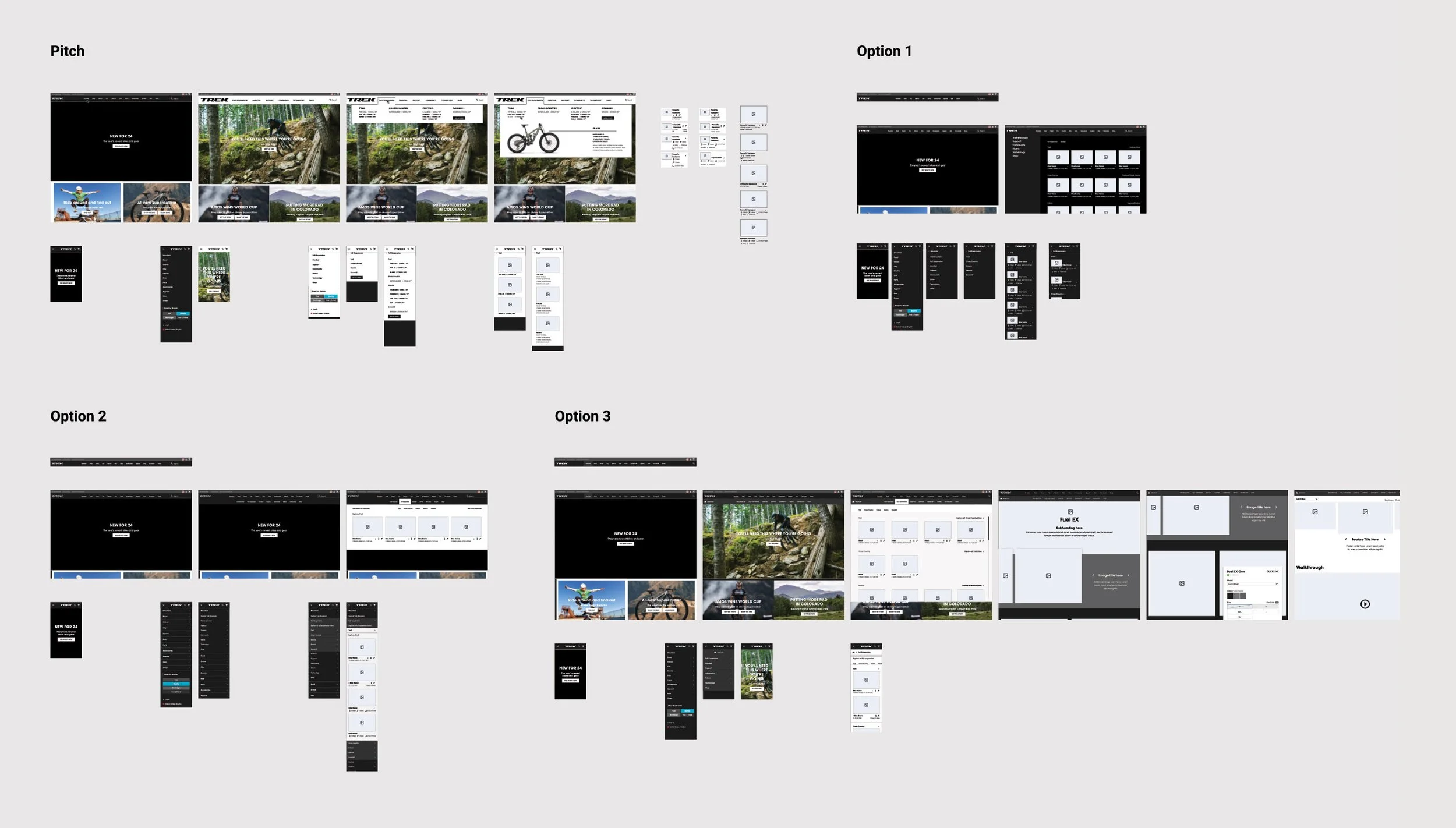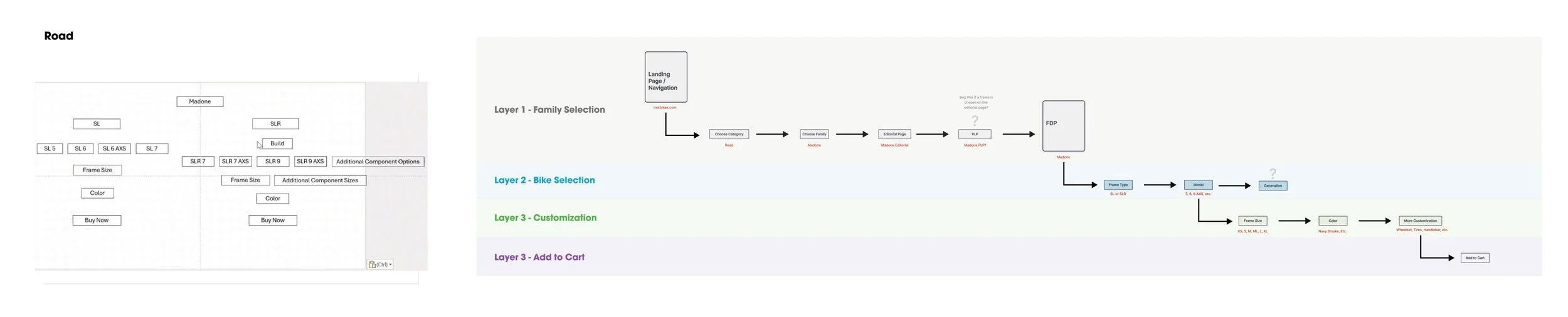 Once it was determined what the product structure and content would be needed for each bike family, I began doing some research and benchmarking to see how the experience could look. I also interviewed store managers to see how customers and themselves customized bikes in store on the current configurator. Mobile was the biggest concern, product detail pages can get very long so it was important to make sure the buy zone was still the priority.