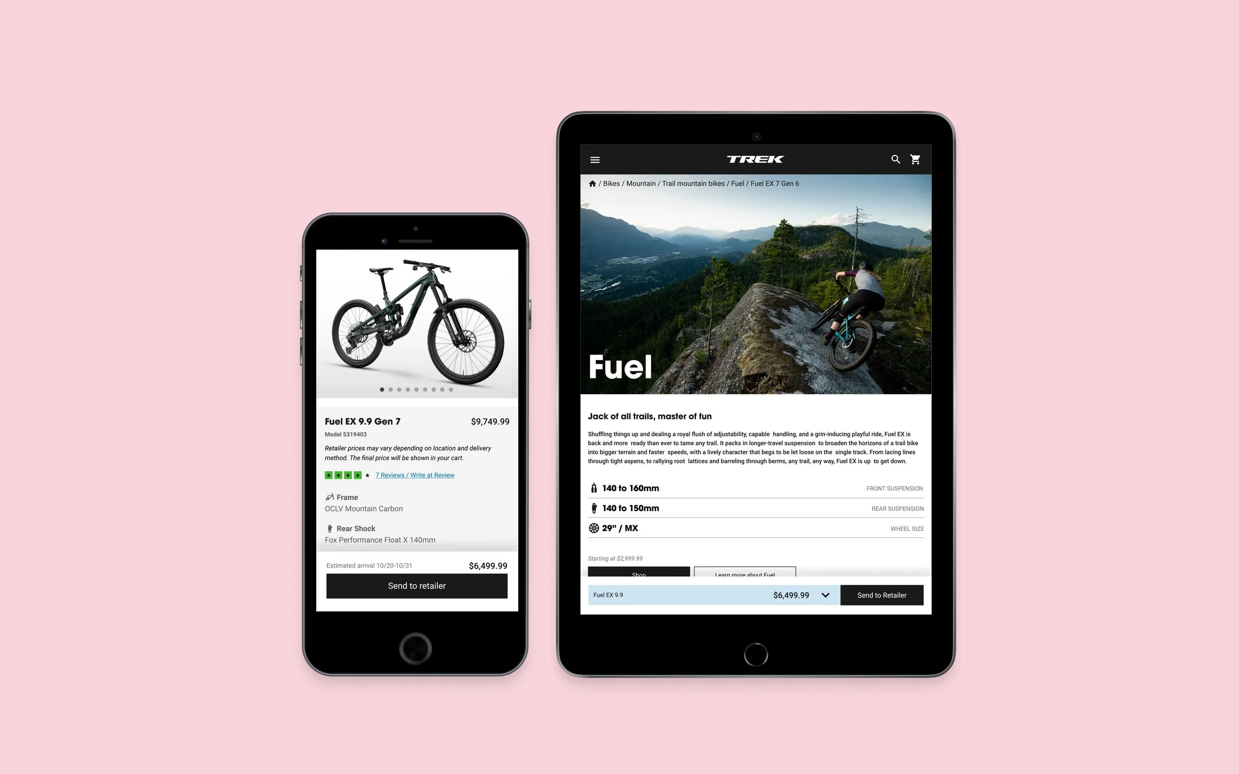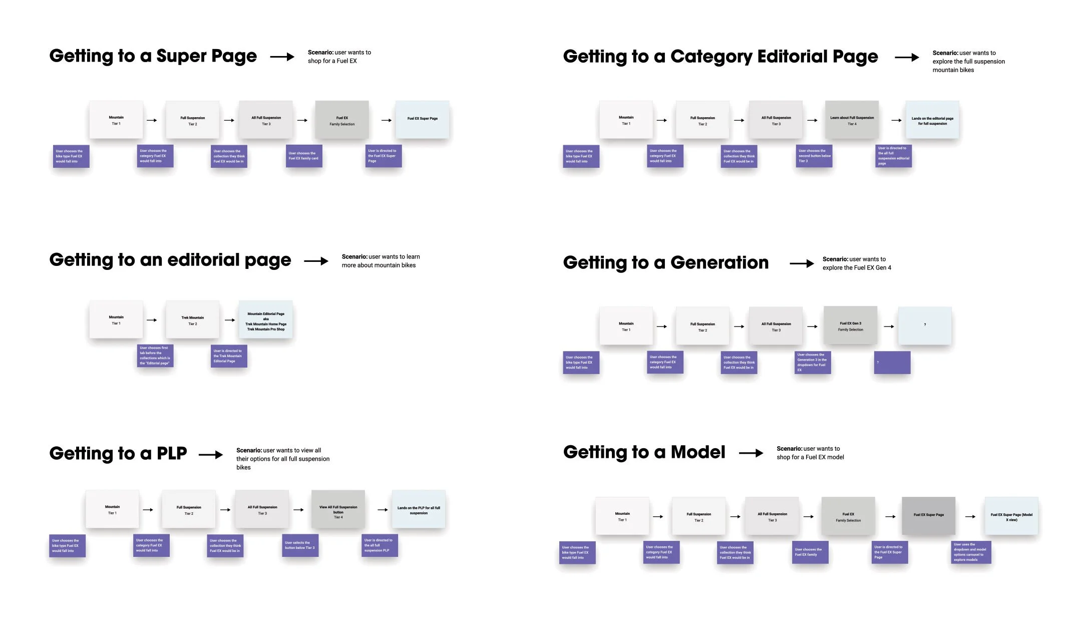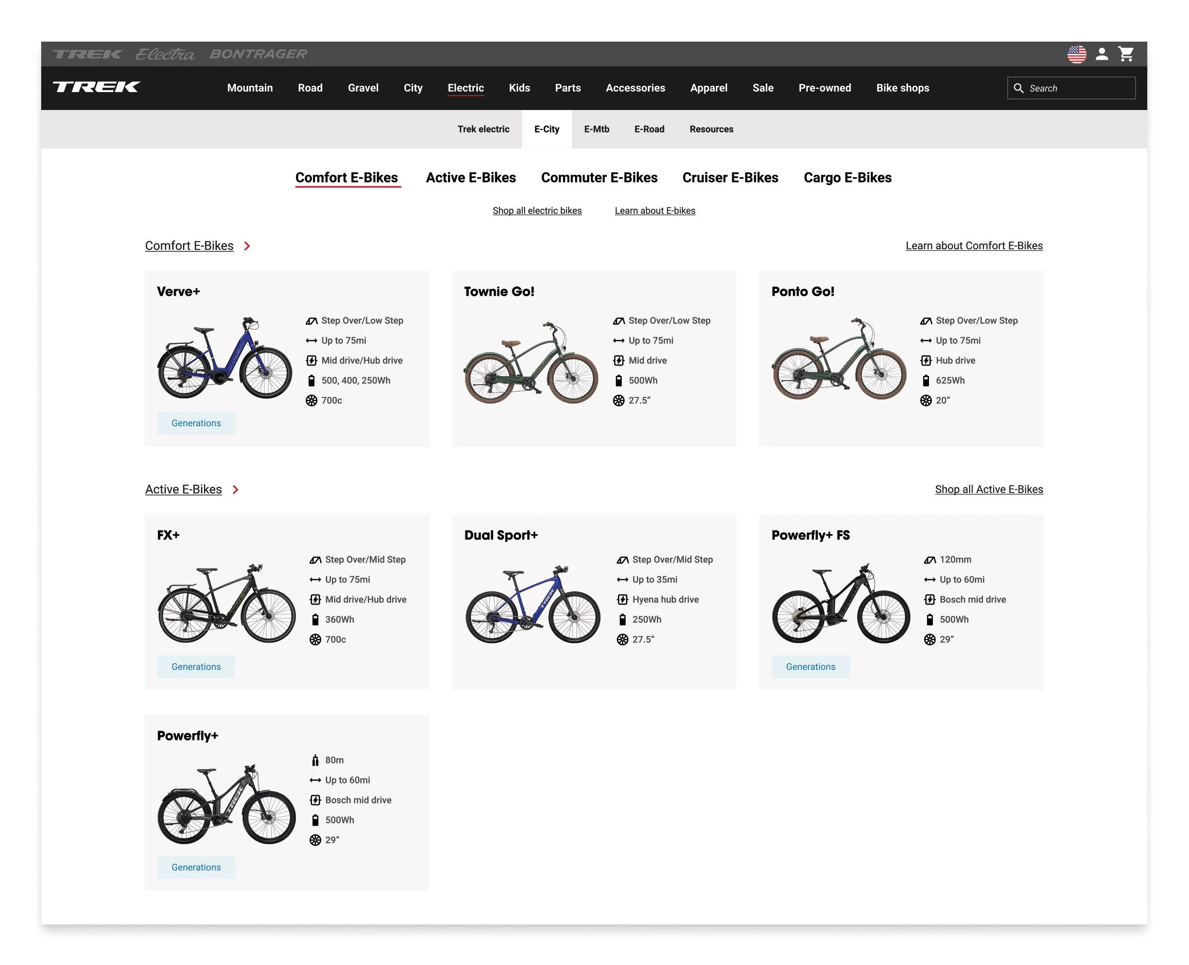 Trek has an extremely large selection of bikes. These bike fall into bike categories, families and models. To help reduce the amount of product detail pages and make browsing bikes less overwhelming, Trek has decided to combine all of the bike models in a family into one product detail page called FDPs (family detail pages). As part of this update, we want to implement our custom bike configurator into these family detail page instead of being a separate experiences, as well as updating redesigning our navigation.