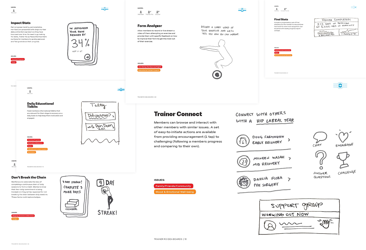 Once all of our ideas and possibilities were brought forward during working sessions, the next step was to develop idea boards. Ideas boards are quick sketches just to get the idea across of potential features. dozens of ideas board are generated, and then as a team and with the client we performed a quick exercise to filter through boards the clients like and that would benefit the app.