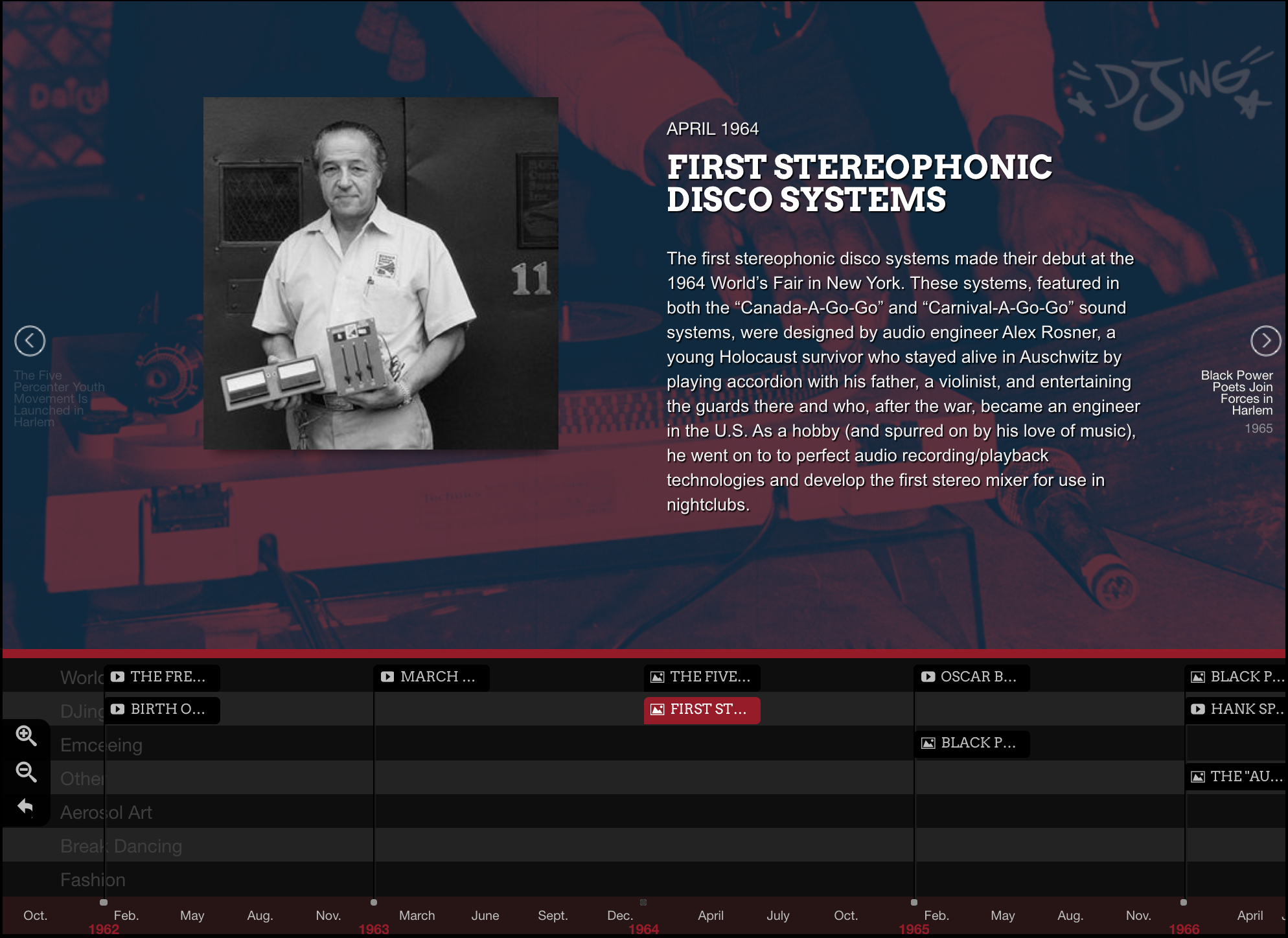 The timeline consists of different sections; World Events, DJing, Emceeing, Aerosol Art, Break Dancing, Fashion, and other. Each of these categories contribute to the history of hip hop.